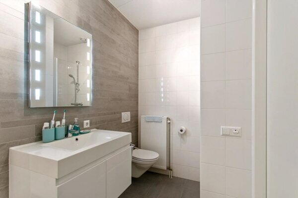De luxe badkamer is volledig betegeld en compleet ingericht met een ligbad, douchecabine met thermostaatkranen, een wastafelmeubel, een spiegel met ingebouwde verlichting en een wandcloset. Daarnaast is er een separate wasruimte met aansluitingen voor wasapparatuur en de opstelling van de cv-ketel.
