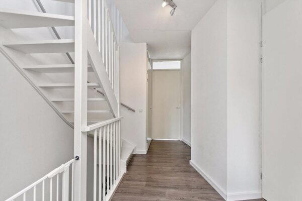 Via de sfeervolle gemeenschappelijke binnenplaats bereikt u de voortuin en de entree van de woning. De hal is voorzien van een tegelvloer met vloerverwarming, die in de gehele begane grond als hoofdverwarming fungeert. In de hal bevindt zich tevens de meterkast met voldoende groepen en een glasvezelaansluiting.