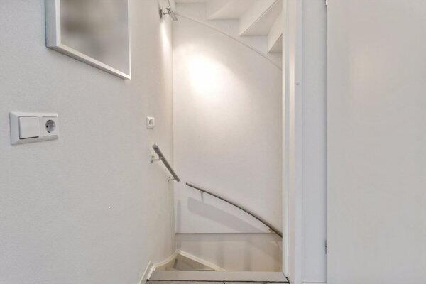 Via een portaal bereikt u de trap naar het souterrain en het volledig betegelde toilet met wandcloset en fonteintje.