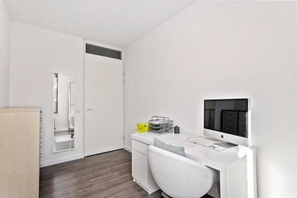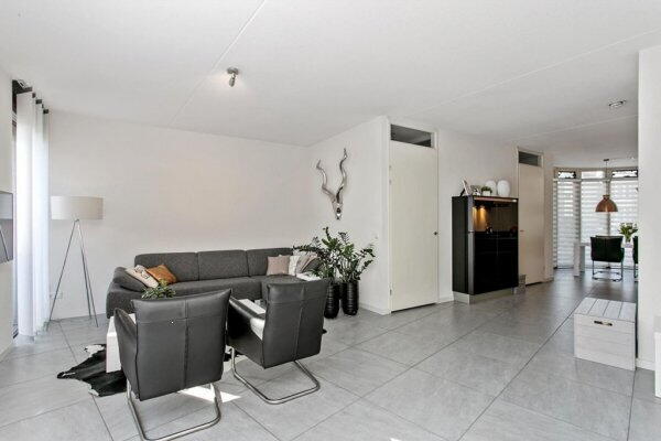 De leefruimte is speels ingedeeld en eveneens afgewerkt met een tegelvloer met vloerverwarming. De zithoek bevindt zich aan de achterzijde en beschikt over openslaande deuren naar het zonnige terras op het zuiden, voorzien van een zonneluifel. De wanden zijn strak afgewerkt met spachtelputz, wat bijdraagt aan de verzorgde uitstraling van het geheel. Aan de voorzijde van de woning bevindt zich de eetkamer met uitzicht op de voortuin.
