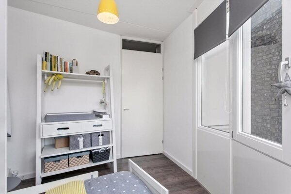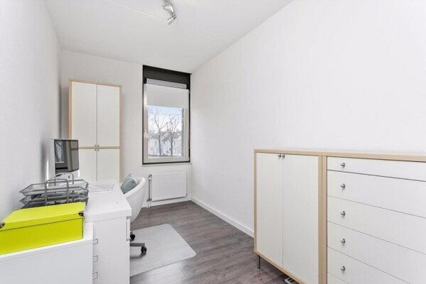 Op de eerste verdieping geeft de overloop met laminaatvloer toegang tot drie slaapkamers en een diepe inloopkast. De ouderslaapkamer is ruim opgezet en biedt een vrij uitzicht. De overige twee slaapkamers zijn eveneens verzorgd afgewerkt met laminaatvloeren en multifunctioneel in te richten als slaap-, werk- of hobbykamer.