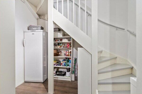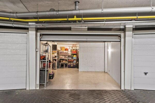 In het souterrain bevindt zich een verwarmd voorportaal met bergruimte en een riante privégarage. De garage biedt ruimte voor het parkeren van een auto en daarnaast voldoende plaats voor extra opslag, wat deze woning bijzonder praktisch maakt.