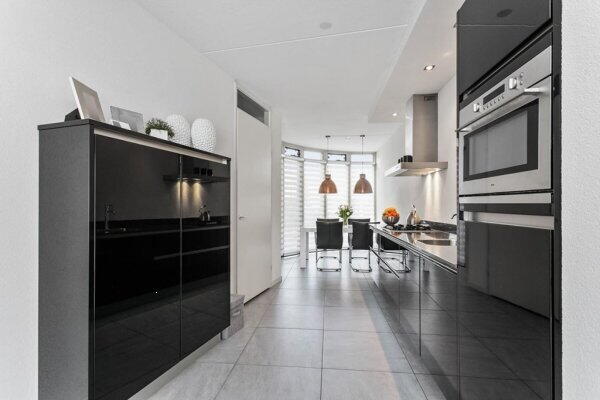 De open keuken heeft een moderne en stijlvolle inrichting en is voorzien van alle benodigde inbouwapparatuur, waaronder een gaskookplaat, afzuigkap, vaatwasser, combi-magnetron en koelkast. Het composiet werkblad geeft de keuken een luxe en duurzame uitstraling.